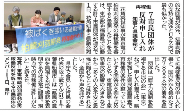 本日12月1日に新潟県知事と県議会議長宛てで、明日から始まる県議会で再稼働に同意しないよう求め提出行動を行いました。
